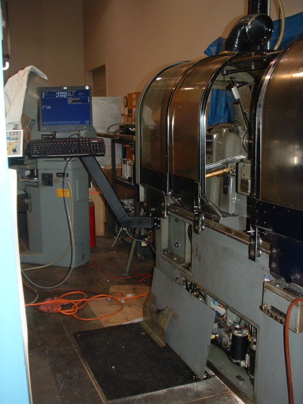 The original console cabinet has been removed. The console is now a flat panel monitor, keyboard and control pendant, all mounted off the machine base.